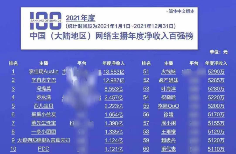 但头部主播的确赚取了极高的佣金。根据斯坦福大学海外商业课题研究组的报告,2021年,李佳琦的收入排国内主播第一名,高达18亿元,超过90%A股上市公司的业绩。