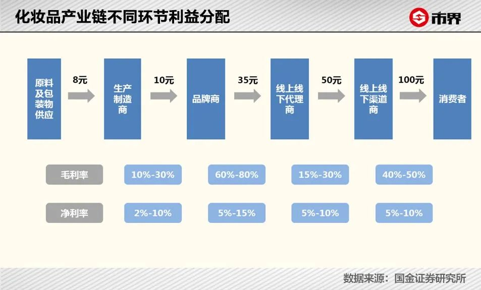 国金证券研究所曾经梳理过化妆品产业链是如何分配利润的。一件化妆品,品牌取走大部分毛利,到了销售渠道,又会被分走一大杯羹。对于在线上起家的新国货品牌来说,必然要分给主播、种草博主等KOL相当高的利润。