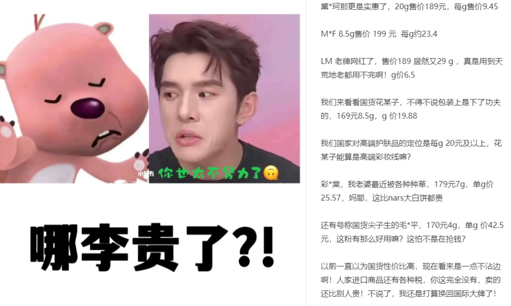 网友们注意到,他所推荐的眉笔仅0.08克重,算下来每克的价格比黄金还贵一倍,继而比较了近几年大火的国货美妆与国际大牌的每克单价,发现了蹊跷。
